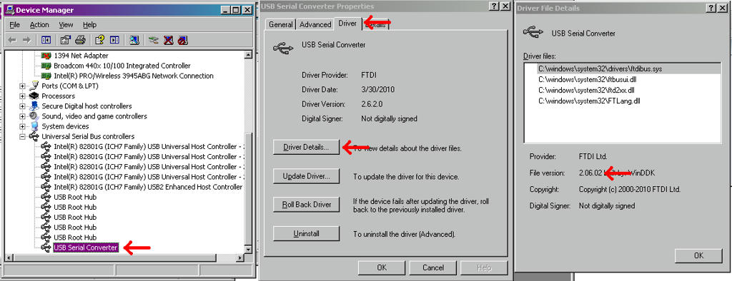 I develop Gecko.NET on Windows XP SP3.  I have the same driver files as you, but my versions are different: ftdibus.sys (the actual kernel-mode driver) is 2.06.02.  ftd2xx.dll (user-mode interface driver) is 3.01.19.  FTLang.dll (probably some internationalization library..?) is 1,4,0,1.  Yes, those are commas.