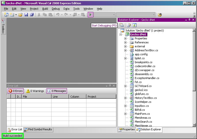 You should see all the source files appear in the Solution Explorer tab.  Either press F5, or click the green triangle at the top.  You will see a little message in the lower left corner when the build succeeded.
