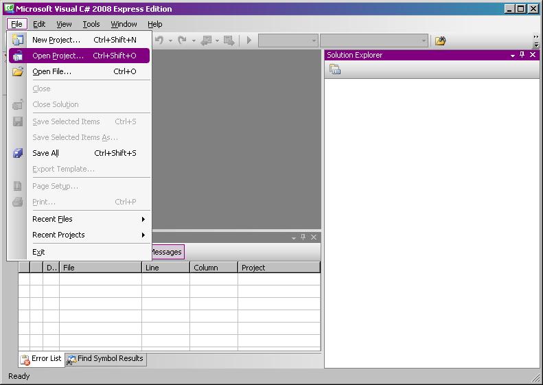 So far so good!  Now open Visual Studio.  Go to File -> Open Project...